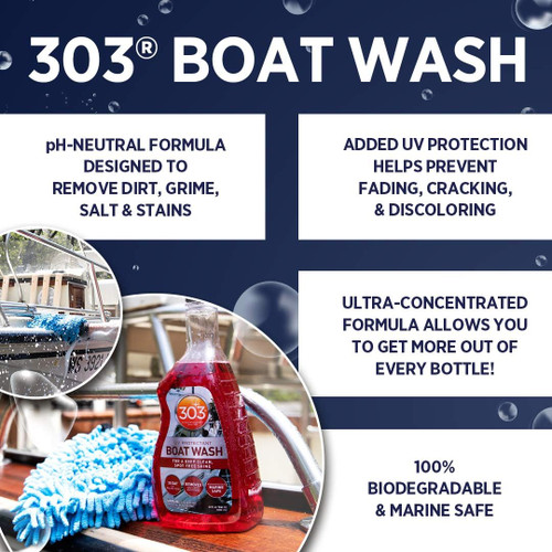 | 303 Boat Wash contains UV added UV inhibitors that prevent fading, keeping your boat looking like new! | Wash your boat with your mind at ease knowing our 303 Boat Wash is specifically designed for Painted Surfaces, Gel- Coat, and Fiberglass. | Get more bang for your buck with 303 Boat Wash because our ultra-concentrated formula will help you get more out of every bottle! |
