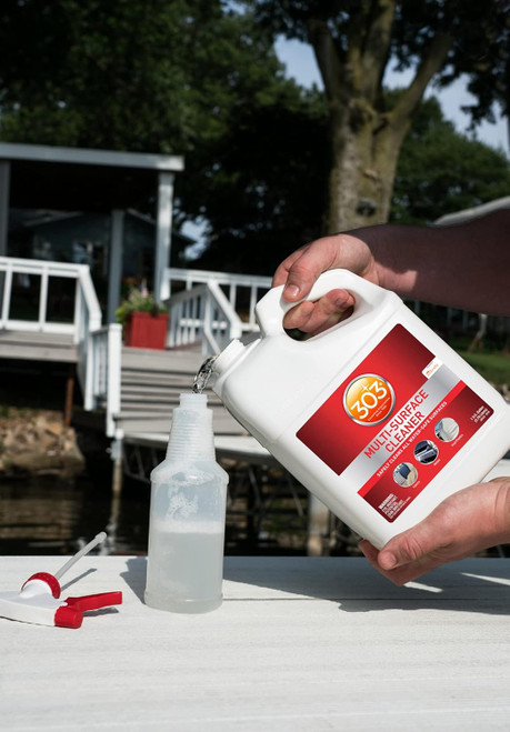 | 303 Multi-Surface Cleaner works on all water-safe fabrics and designed to clean even the most delicate fabrics. | After a family outing, clean up food and drink marks from your boat's interior and galley. | Use on your boat or spa cover to remove dirt or water marks, perfect before sealing with 303 Aerospace Protectant. | Take extra care of your furniture. 303 Multi-Surface Cleaner unique formula will rinse residue free. |