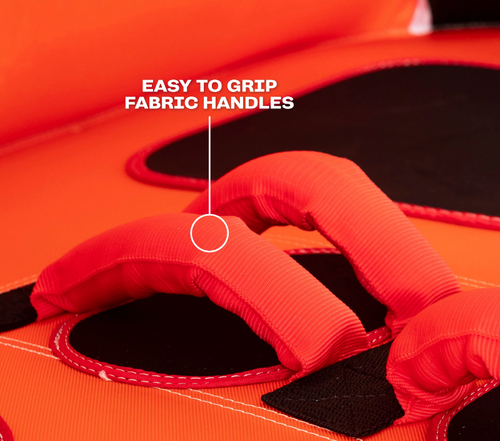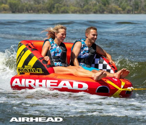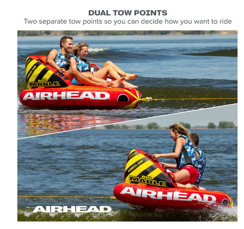 Whether you’re cruising on low-gear or speeding over waves, 10 perfectly-placed double webbing foam handles help keep both riders on board. Plus, our Patented Speed Safety Valve and Kwik-Connect tow point make this chariot easy to attach and detach. Airhead’s Big Mable is also versatile: with two ways to tow, riders can sit or kneel in either direction for thrilling tubing every time.