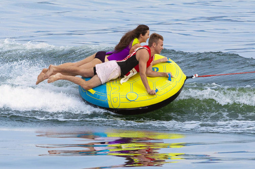 AIRHEAD Comfort Shell 65 Towable Tube for Boating-1-2 Rider. This 2 person deck tube carries a crowd with precision, and its large, flat shell makes it easy to slice through water and cut corners without losing control. This Airhead Comfort Shell 65 and 30-gauge RF welded PVC bladder are wrapped in heavy-duty plush neoprene foam. Add this to the foam-filled webbing handles and expertly-placed boarding straps, and you have the softest possible riding experience among all water tubes for boats.