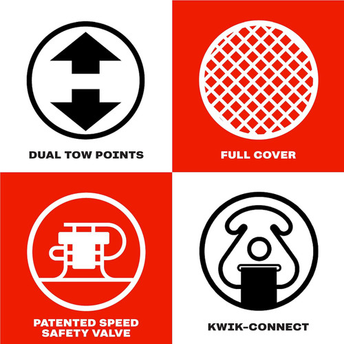 | Constructed of heavy-gauge PVC, RF welded seams, and a heavy-duty double stitched full nylon cover, the Lil Mable towable is made for durability. | Dual tow points with a Kwik-Connect in the front and the option to add a Kwik-Connect to the rear tow point. | Patented Speed Safety Valve for fast and easy inflation and deflation with comfortable foam- filled handles and knuckle guards make for a fun and safe experience on the water. |