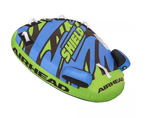 Airhead Shield 1 Rider Towable Tube for Boating. Airhead Shield is an amazing ride for all ages of thrill-seekers! No matter how wild the ride is, stay on with topside stabilizer fins. The deluxe nylon-wrapped handles with neoprene knuckle guards provide a sure and comfortable grip. Shield has a tough heavy-gauge PVC bladder, fully covered with a durable double-stitched nylon cover. Shield is 56˝ x 48˝ (deflated) and is equipped with a heavy-duty Kwik-Connect for easy and secure hook-ups. A patented Speed Safety Valve provides the ultimate in inflation and deflation convenience and speed.