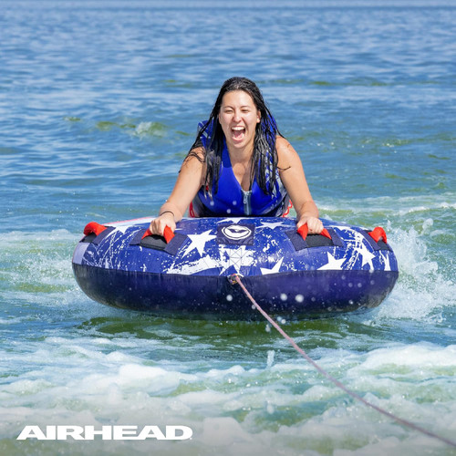 Airhead Stars & Stripes | 1 Rider Towable Tube for Boating. Display your love for the USA, and have fun doing it! This deck tube is perfect for the Fourth of July, Memorial Day, or showing your loyalty any time of year. Stars & Stripes is a 1 person towable tube crafted for riders who love to celebrate in style, but its benefits range far beyond aesthetics.