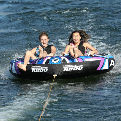 Airhead Turbo Blast 2 Towable Tube For Boating-2 Rider. If you’re looking for a tube designed for speed, look no further than the Airhead Turbo Blast 2. This 2 person towable tube features an aerodynamic shape that slices through wake while riders sit back and enjoy the ride.