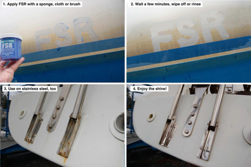 FSR (Fiberglass Stain Remover) is a unique stain absorbing gel that is ideal for removing oil, rust, exhaust, waterline and transom stains.