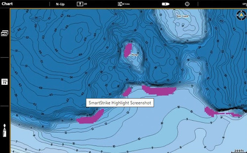 - SmartStrike – Highlights areas of the lake map where fish are most likely biting. (*Select HD Lakes Only)