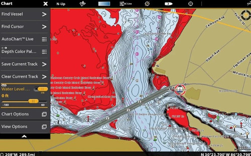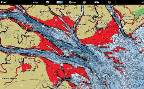 - Shallow Water Highlight – Easy-to-see red shading highlights shallow water areas on an adjustable range from 0 to 60 feet.