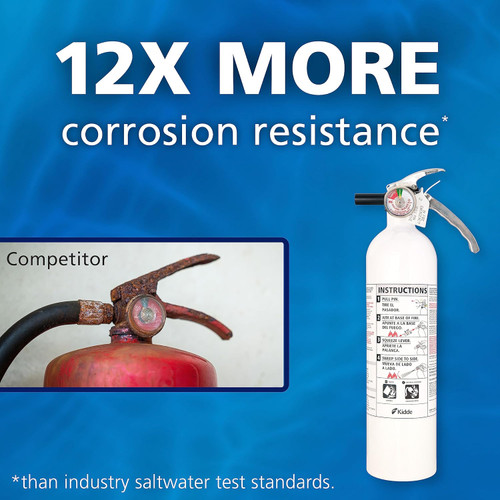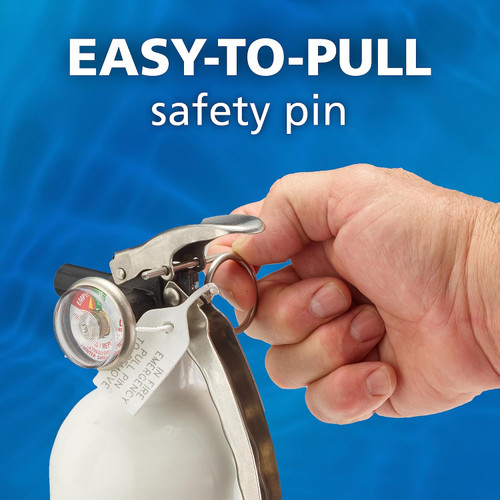 KIDDE FIRE Marine USCG Approved Extinguisher 10BC 2.5# is a single use extinguisher with a dual-purpose dry chemical suitable for use on Class B (liquids & gases) and Class C (energized electrical equipment) fires. It is fitted with a pressure gauge that provides at-a-glance status, an easy to pull safety pin and impact resistant metal valve, handle and lever. The body is made of seamless, powder coated aluminum and features an anodized forged aluminum valve body and polished stainless steel handle, lever, pressure gauge and pull pin. Comes with an UL approved strap retention bracket and is U.S.C.G. approved when fitted with supplied mounting bracket.