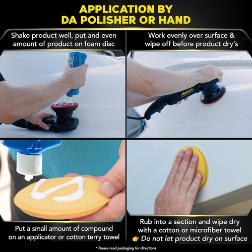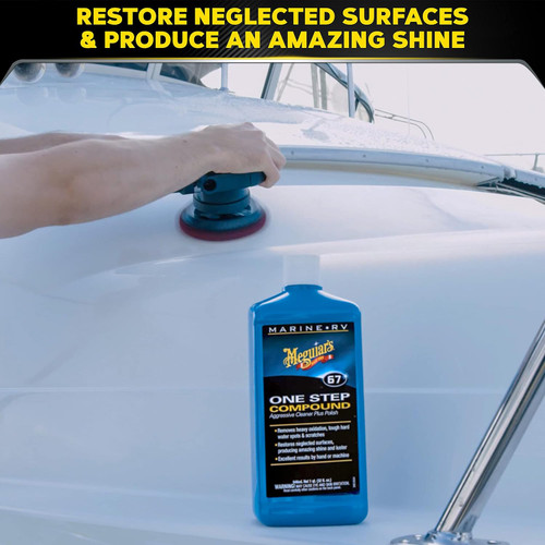 Meguiar's Marine/RV One Step Compound is an advanced aggressive, yet safe cutting compound with polish that cleans and restores gloss to gel coat surfaces in one step. It removes moderate to heavy oxidation, scratches, stains, and tough water spots on all fiberglass and painted gel coat marine or RV surfaces. Incredible results by hand or by machine.