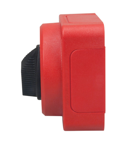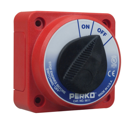 Perko battery switches are designed for surface mounting. Compact disconnect switches have bright red polycarbonate reinforced housings for safety with large easy-to-turn black knobs. The housing of the heavy duty switches are red fiber-reinforced polycarbonate.
