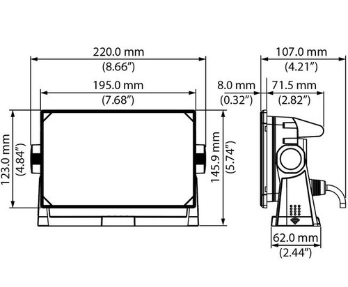 | Dimensions W x H x D | With bracket: W: 220 mm (8.66") x H: 145.9 mm (5.74") x D: 79.5 mm (3.13") No bracket, no suncover: W: 195 mm (7.68") x H: 123.0 mm (4.84") x D: 79.5 mm (3.13") No bracket, with suncover: W: 199.9 mm (7.87") x H: 127.9 mm (5.04") x D: 84.5 mm (3.32") |