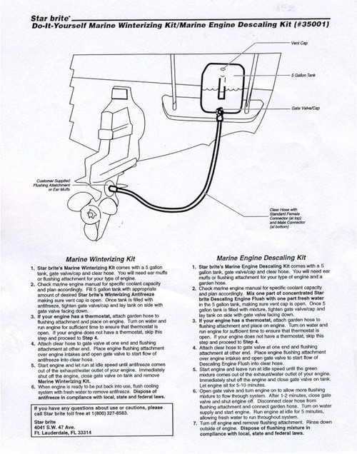 Starbrite's Marine Winterizing Kit comes with a 5-gallon tank, gate valve/cap and clear hose. You will need ear muffs or flushing attachment for your type of engine. Check marine engine manual for specific coolant capacity and plan accordingly.