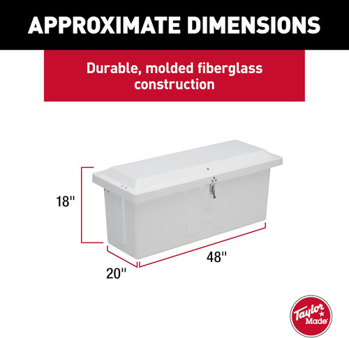 Keeping your boating and fishing gear organized has never been easier! Taylor Made dock boxes feature a durable molded fiberglass construction enhanced with a UV-resistant gelcoat that protects your outdoor storage box from the damaging effects of prolonged sun exposure, such as fading and cracking. Complete with corrosion-resistant stainless-steel hardware and a lockable latch, you can confidently and securely store your life jackets, boat fenders, marine tool kit and more.