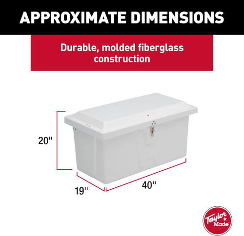 Taylor Made Low-Profile Dock Box-40"L x 19"W x 20"H. Discover unmatched convenience with Taylor Made fiberglass dock boxes. With their smooth, scratch-free interior and stainless-steel hardware, only Taylor Made deck boxes combine style with functionality to meet all your outdoor storage needs.