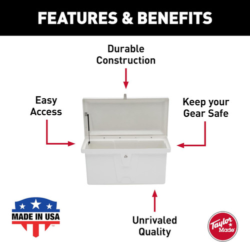 - EASY ACCESS - Our deck box is a breeze to open and securely close with the built-in gas lift shocks, especially helpful with an armful of gear. These gas shocks, standard in all Taylor Made dock boxes, keep the lid open, even in high-wind areas and unstable docks