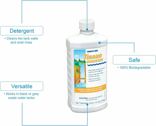 Thetford's Tissue Digester for Effortless Waste and it will Break Up Tissue-causing Clogs and Keeps Drain Lines Clean and Flowing Free Specially formulated to prevent tissue buildup in your black water tank and drain lines.