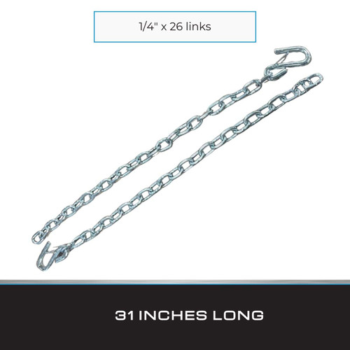 Tie Down's Zinc Plated Safety Chains offer dependable security and peace of mind during towing operations. Sold in pairs and designed as replacement parts, these safety chains are engineered for horizontal pulling applications. The chains come with durable s-hooks for easy attachment to your trailer and towing vehicle. As a vital safety precaution, these chains are only as strong as their weakest link, reinforcing the importance of using high-quality and reliable components. With a Class three rating and a carrying capacity of 5,000 lbs., they provide robust support for various towing needs. Crafted from sturdy 1/4-inch steel and zinc plated for corrosion resistance, these safety chains ensure long-lasting durability and performance.